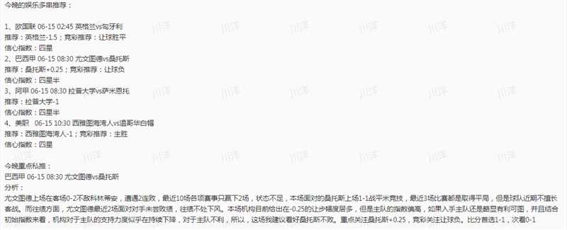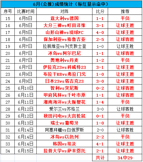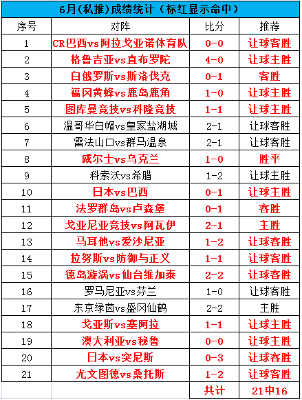昨天下午和晚间的公推私推再度双红啊!可惜晚间的串错在英格兰,遗憾4中3。今天公推的比赛我们关注巴甲的赛事。目前整体6月公推是34中29,命中率85.3%,私推21场命中16场,命中率76.2%。