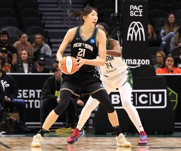 中国女篮国手韩旭(21号)效力于纽约自由人队,上轮对阵天空她出战21分钟,8投4中、罚球3中2,得到10分。