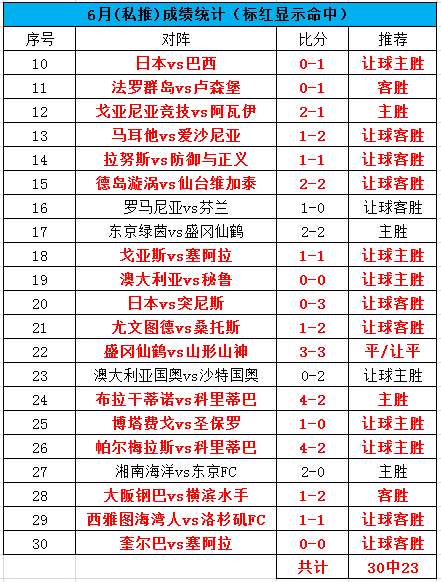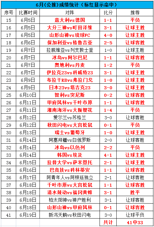 中午早场的日乙比赛遗憾未能命中,我们继续战斗!晚间亚奥赛决赛送上!目前6月总体公推是41中33,命中率80.5%,私推是30中23,命中率76.7%。