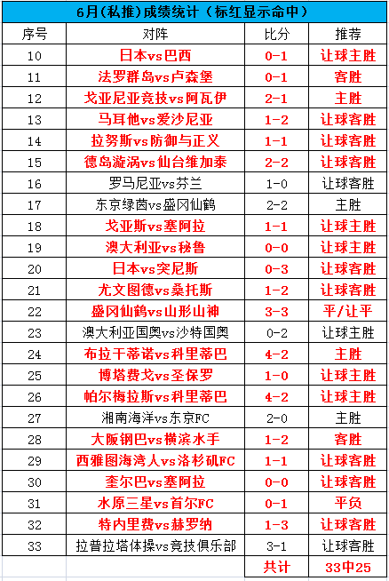昨天命中阿甲,美职没有命中,辛辛那提1-0击败奥兰多城,还是在主场赢下了胜利。目前6月总体公推是53中36,命中率67.9%,私推是33中25,命中率75.7%。今天下午是日韩的赛事,我们再关注一场竞彩单关的韩职赛事。