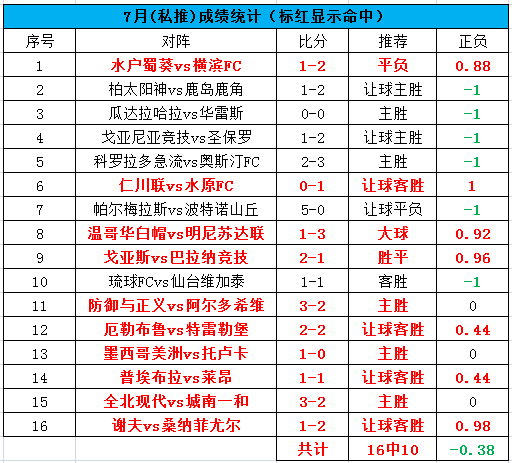 昨天周六公推6中5,私推2场全部命中,昨天总体8中7,状态非常不错!目前7月整体公推47中30,命中率63.8%,私推16中10,命中率62.5%。私推6连红!今天我们继续战斗!先关注一场日职的赛事!