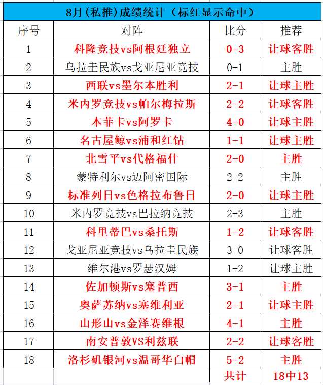 昨天周六的状态还是非常不错的!目前公推的8场命中6场,私推的3场全部命中。8月整体公推48中30,命中率62.5%,私推18中13,命中率72.2%!今日我们继续战斗!晚上的英冠赛事为你助力!