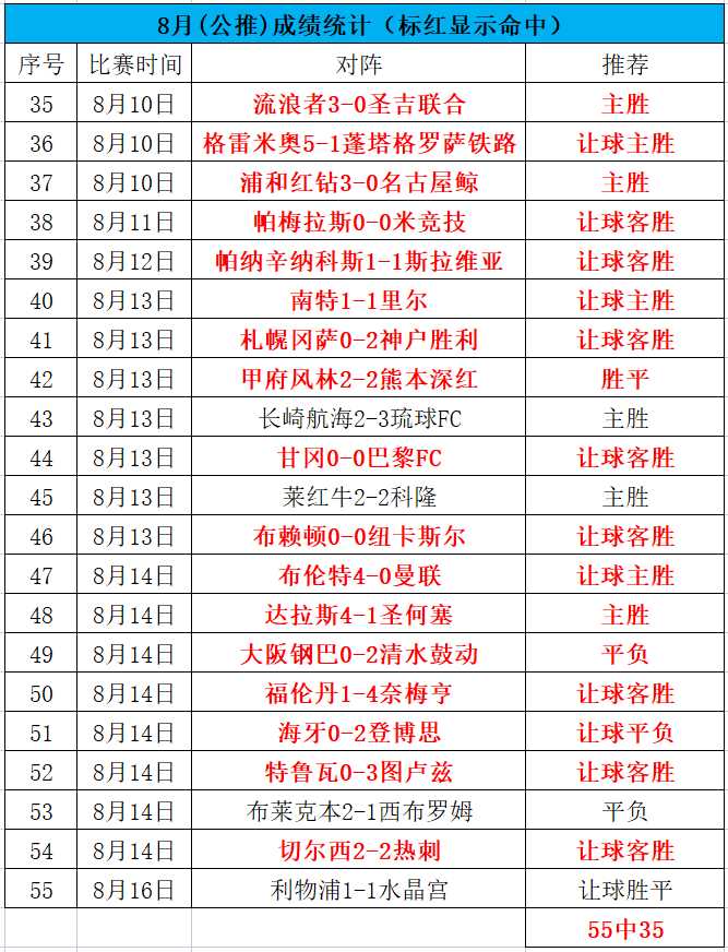 昨天公推的利物浦被红牌打乱节奏,红军开局还是迟迟找不到感觉,私推的赫根命中。目前整体8月公推55中35,命中率63.6%,私推21中15,命中率71.4%,今天继续战斗!先关注一场欧冠单关场次: