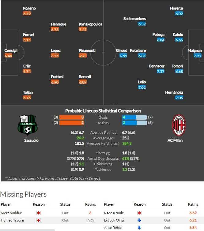意甲一周双赛,第四轮首战萨索洛在主场迎战卫冕冠军AC米兰。主队的萨索洛在新赛季首战便挑战强敌尤文,比赛中萨索洛可以说毫无还手之力,最终以0-3的比分完败给 强大的斑马军团,不过在随后球队迎来了反弹,先是1-0小胜莱切,球队首席射手贝拉尔迪也收获了其开季首球,上轮面对斯佩齐亚也顺利在客场带走1分,但需要值得注意的是在上赛季球队主场收官战中正是对阵AC米兰,当时萨索洛以0-3的比分完败给对手。人员方面目前仅有后卫穆尔多以及轮换中场特劳雷伤缺,其余成员均可出战。
