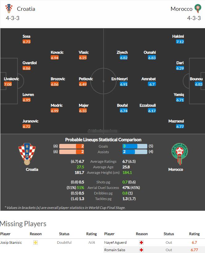 世界杯迎来了季军战交锋,两队在本届杯赛的表现都值得外界肯定,克罗地亚阵中多名主力虽然均已经超过30,但是其竞技实力和经验值都呈现出非常出色的一面,从小组赛开始取得1胜2平的不败战绩,当中有2场零封对手,随后16强面对亚洲列强日本,两队常规时间握手言和,点球淘汰对手,八强战更是上演了含金量十足的一战,凭借超强的比赛状态与巴西90分钟内互交白卷,加时赛在被先进1球的不利局面下,凭借佩特科维奇在终场前的绝平进球逼平比分,点球大战中4-2击败巴西,在半决赛开始之前,个人对克罗地亚的防守体系相当认可,其中格瓦迪奥尔这名小将的表现尤为抢眼,另外中场几名主力莫德里奇、布罗佐维奇等人其实也都有非常高光的表现。但值得注意的是其实格子军团在三场淘汰赛中其实自身仅有一个常规时间进球,球队之所以能够走到半决赛更多的是依靠其防守体系,而在与摩洛哥小组赛对阵时,两队其实也是打出了一个0-0。