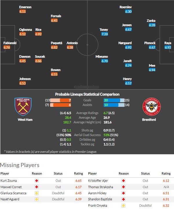 西汉姆本赛季联赛发挥不佳,目前球队暂列积分榜第16位,仅仅高出降级区1分,传统劲旅沦为了保级球队,而此役面对着中游球队布伦特福德,西汉姆势必要希望主场止颓。但是从世界杯后的首战表现来看,球队做客对阵领头羊阿森纳,在阿森纳阵容不整的情况下,最终西汉姆还是以1-3的比分完败给同城对手,这无疑对于球队信心上有着不小的打击,要知道目前西汉姆联赛中已经处于四连败轨道,另外近两个联赛主场也是先后不敌水晶宫和莱城。而在人员方面本场包括祖马和科尔内因伤缺阵,另外参加了世界杯季军战的阿格尔德本场出战存疑。