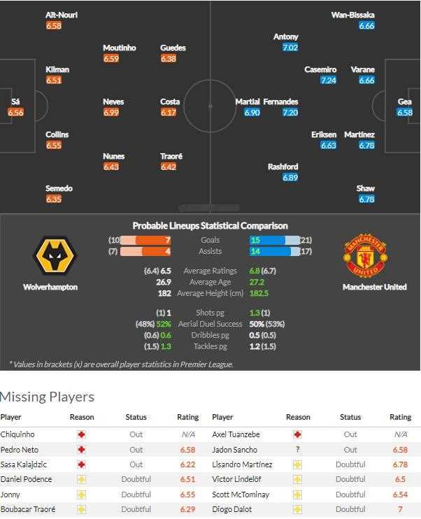 世界杯结束后,英超马不停蹄的迎来了节礼日的连续快车赛程,而在上轮狼队面对着保级球队埃弗顿,比赛中狼队早早出现失球,不过随后球队很快的扳平了比分,并在下半场补时阶段凭借着艾特努里的绝杀球以2-1的比分取胜对手,而这也是新任主帅洛佩特吉上任以来首度联赛胜利,而从人员上来看,本场狼队也是迎来利好,包括二号射手波登斯、中前卫布巴卡特劳雷、主力边后卫乔尼目前都已经伤愈可以出战,但是值得注意的是本赛季狼队进攻端发挥低迷,在希门尼斯、科斯塔、黄喜灿等人均状态不佳的情况下,目前16轮战罢球队仅有10个进球,是目前联赛进攻端最差的队伍。本场面对着拥有利马和瓦拉内等人的曼联后防,狼队想要进球难度也不小。
