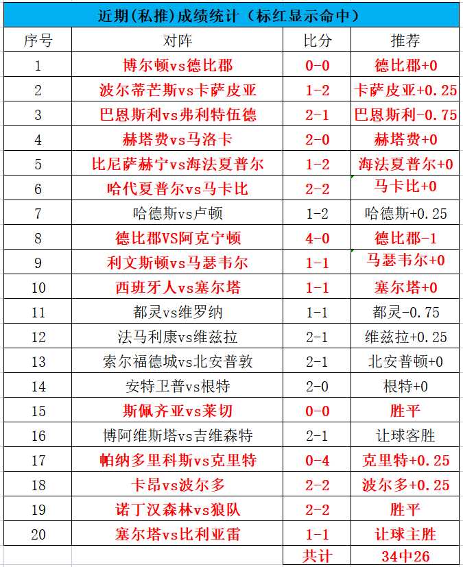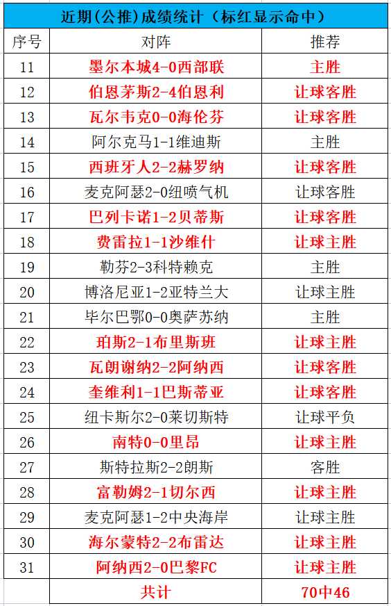 公推近10中7,私域达到4连红!昨天下午的一场澳超未能命中,麦克阿瑟防守端质量还是不足,晚场的2串1顺利命中,还有一场早场的北单墨超没有进行。今天我们继续战斗!公推近70中46,命中率65.7%,私推近34中26,命中率76.5%。PS:订阅川洋私享服务的朋友可以免费查看川洋的每一篇文章(包含任九),更有私享比赛精彩推荐,指数变动提醒,并且还能与我无限畅聊哦!川洋与您携手并进。