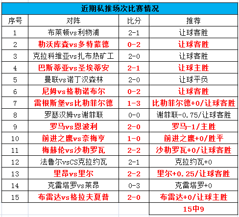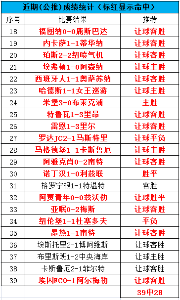 兄弟们,昨天公推的赛事3中1,下午场的澳超被点球绝杀,晚场的菲尔特在对手红牌的背景下都没有守住优势,还是比较可惜,不过昨晚私推还是顺利命中。今天我们继续战斗!近期公推近39中28!命中率71.8%!私推15中9!命中率60%!PS:订阅川洋私享服务的朋友可以免费查看川洋的每一篇文章(包含任九),更有私享比赛精彩推荐,指数变动提醒,并且还能与我无限畅聊哦!川洋与您携手并进。