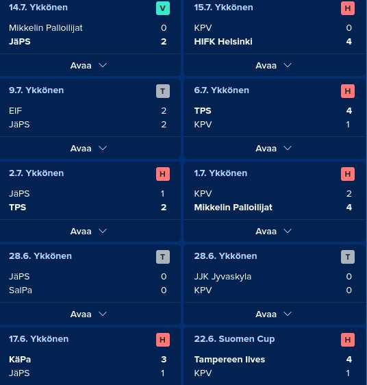 At the team news front there are good news at JäPS as they get back 3 players from suspension - Hussein Mohamed, Tobias Karkulowski and Gullit Zolameso - and on the injury list there are only a few doubts, at KPV Curinga is a doubt, they would definitely need new players and the transfer window is open. Too bad there is no longer money available.