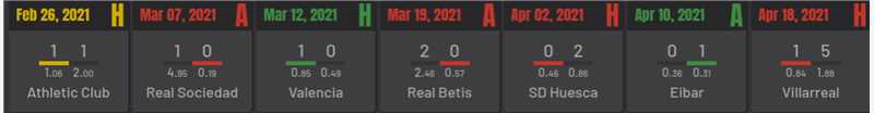 They indeed lost to Huesca at home and created very little goal expectation, won Eibar in a very boring game with close to 0 chances, and the last weeks 1-5 home loss to Villarreal talks volumes of their form. It has to be noted also that Eibar in their following match lost 5-0 away Atletico Madrid, and recorced exactly 0.00 of xG in that game!