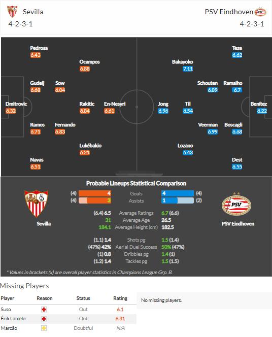 PSV埃因霍温目前暂列小组第二,与第三的朗斯同积5分,目前球队具备充足的晋级战意,而在上一场欧冠比赛中球队以1-0小胜朗斯,联赛方面目前球队延续着长连胜表现,另外球队阵容齐整,不过在过去的两个欧冠客场,埃因霍温都未能迎来胜利,本场让步开出平局,外界没能给到塞维利亚主场支持,在首回合交锋中两队也是打出了2-2的比分,结合两队目前状态上差距,综上本场看好客队不败格局。