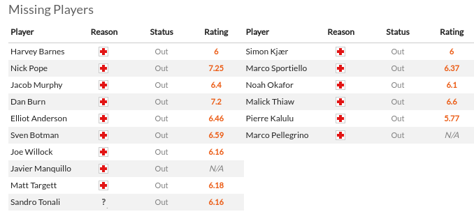 A huge number of important players, the biggest of them all is keeper Nick Pope who had rescued Newcastle so many times this season. The replacing Slovak keeper Dubravka is not bad, but it makes a big difference.