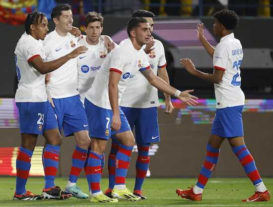 巴萨在半决赛凭借莱万和亚马尔的进球2-0击败奥萨苏纳各项赛事3连胜,也有希望成功卫冕超级杯冠军。在赢下奥萨苏纳的比赛中,替补上场的亚马尔最后时刻打进巴萨的第2个进球,也是巴萨自去年9月欧冠5-0大胜安特卫普以来,首次净胜2球赢下对手的一场比赛,目前在西甲联赛巴萨第3,落后皇马7分。阵容上,亚马尔有望取代拉菲尼亚,后者在对阵奥萨苏纳的比赛中腿筋受伤。马丁内斯和加维将分别因肌肉和膝盖受伤而缺席比赛。本场初始皇马0.25,虽然在西甲联赛领先7分,但皇马面对巴萨并没有任何交手优势,尤其巴萨各项赛事4连胜5场不败近期状态稳定下,本场冠军争夺战,皇马想要在90分钟解决战斗难度较大,我看巴萨90分钟不败更加值得期待,推荐比分:1-1,1-2。