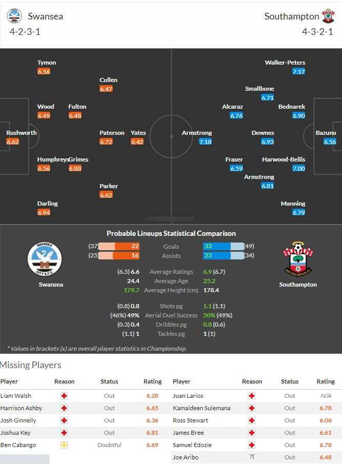 英冠联赛继续火热进行,本场由目前排名第15的斯旺西对阵第3的南安普顿。斯旺西在近期的总体表现不俗,球队近四场各项比赛取得2胜2平的不败战绩,其中上轮球队与伯明翰打出了2-2的比分,但比赛中球队在最后时刻被对手绝平比分,错失3分的他们势必对其士气会有所影响。不过球队在近6个联赛主场比赛中仅有一败,是以1-2的比分小负给米堡,还是可以看出球队近期主场具备十足韧性。但目前球队阵容依旧不整,中后场仍有不少主力休战,包括球队主力中场沃尔什(13场)、中卫卡班戈(22场)、右后卫奇伊(21场1球1助)都要继续伤缺。其中卡班戈的缺席最为严重,在他缺席的6场联赛里,球队4负1平仅1胜,且没有1场零封。