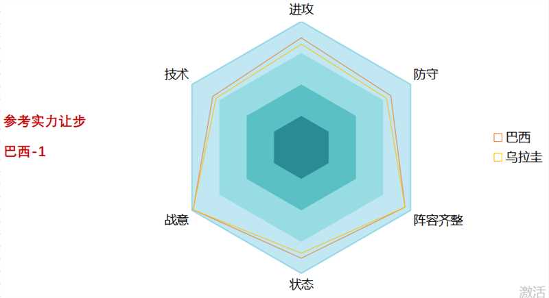 本场比赛从六芒星图可以看出,巴西实力优势明显,五星巴西本场坐镇主场,毫无疑问将在场面上压制乌拉圭。