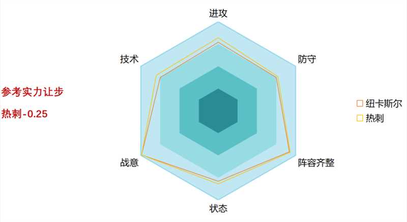本场比赛从六芒星图可以看出客场作战的热刺在整体实力上占优,不过两队的状态都比较一般,并且防守端都有问题,这是一场难度较大的比赛。