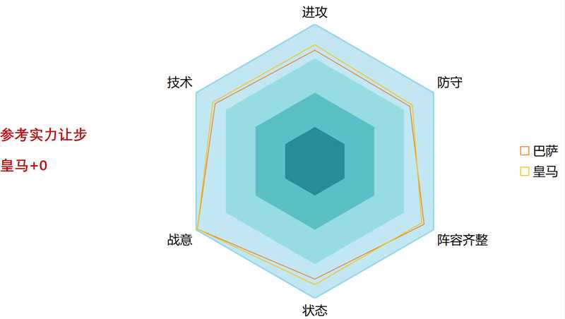 本场比赛从六芒星图可以看出客场作战的皇马在整体实力占优,并且在状态上也更为出色,这将会是一场反客为主的比赛。