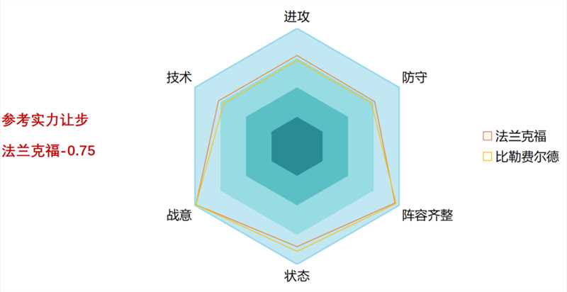 本场比赛参考实力让步为法兰克福-0.75,与机构给予的让步一致,法兰克福与弗赖堡的实力定位接近,此前弗赖堡主场同样的给予了-0.75 的让步,那场比赛弗赖堡在缺少两名后防主力的情况下领先两球被扳平,弗赖堡能够打进两球,法兰克福大概率也能做到,而且目前法兰克福阵容完整,防守也会比那场的弗赖堡更靠谱一些,因此看好主队能够正路打出取得3分。